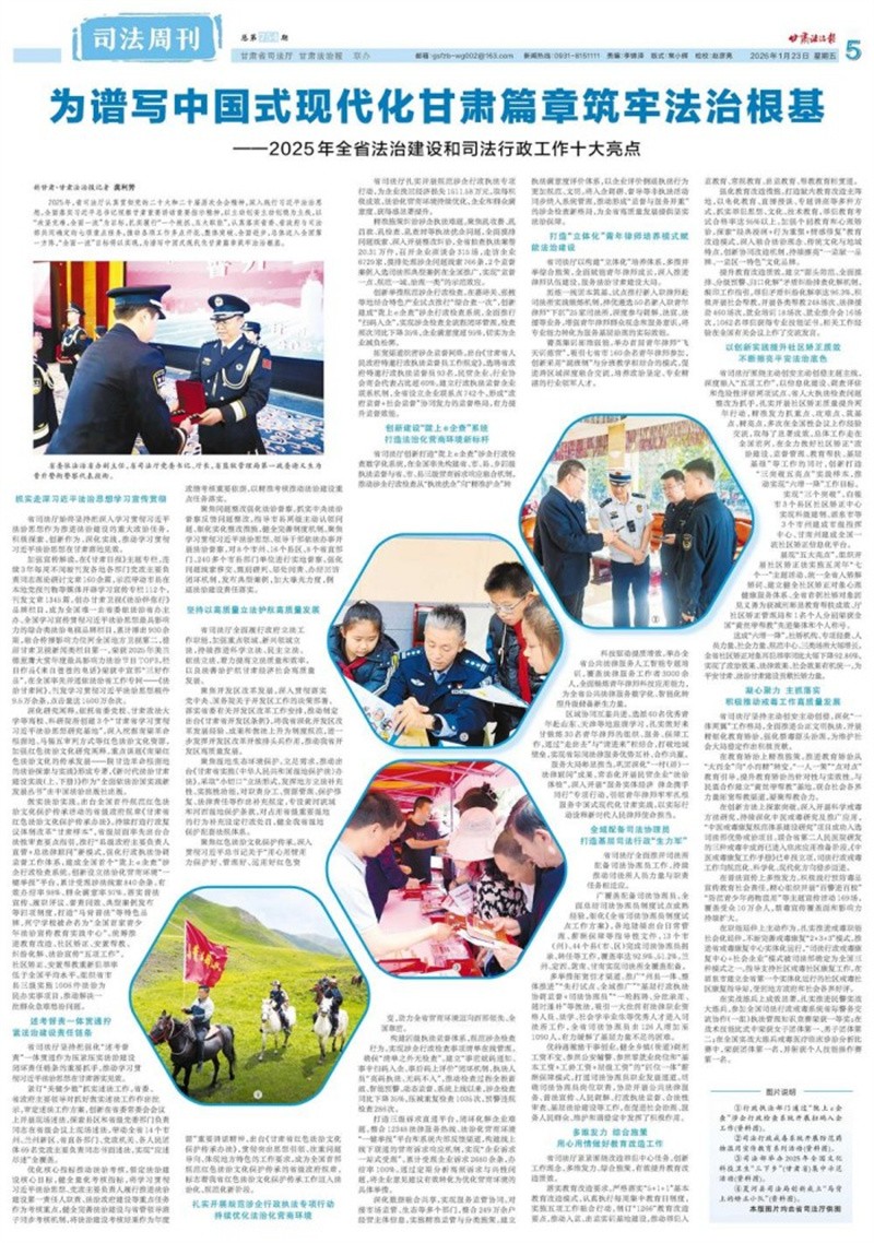 加强宣传解读。在《甘肃日报》主题专栏,连续3年每周不间断刊发各地各部门党政主要负责同志理论研讨文章160余篇,示范带动市县在本地党报刊物等媒体开辟学习宣传专栏112个,刊发文章1345篇。创办甘肃卫视《法治伴你行》品牌栏目,成为全国唯一由省委依法治省办主办、全国学习宣传贯彻习近平法治思想最具影响力的综合类法治电视品牌栏目,累计播出900余期,融合传播影响力位列全国地方卫视第二,稳居甘肃卫视新闻类栏目第一,荣获2025年美兰德蓝鹰大赏年度最具影响力法治节目TOP3,栏目作品《来自爸爸的电话》荣获中宣部“三好作品”。在全国率先开通依法治省工作专网——《法治甘肃网》,刊发学习贯彻习近平法治思想稿件9.5万余条,点击量达1500万余次。