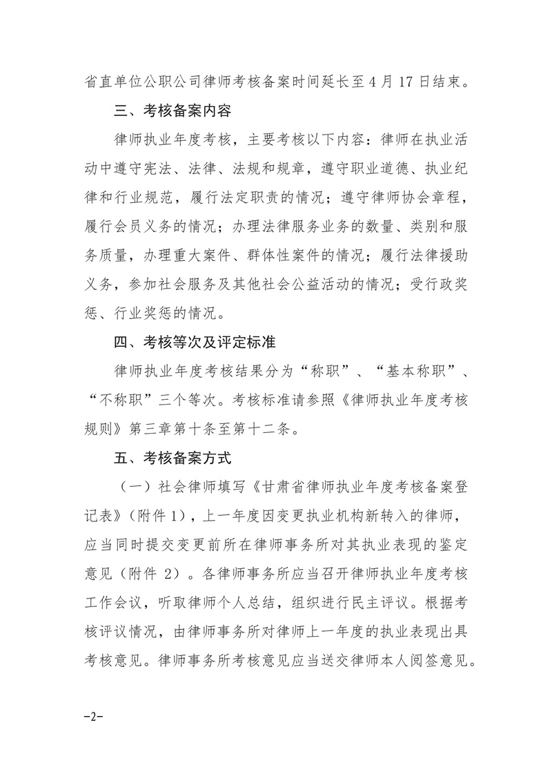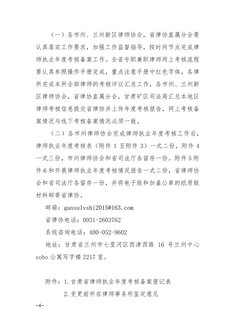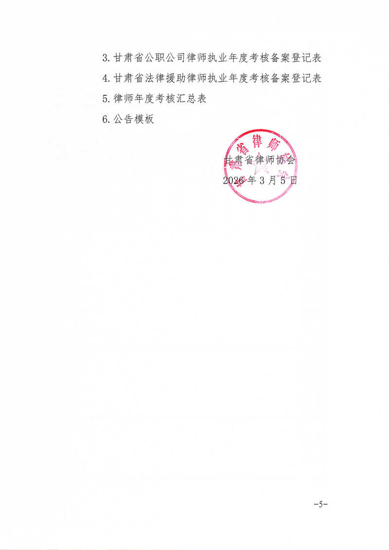甘肃省律师协会关于做好2025年度律师执业考核备案工作的通知 2026-03-05 甘肃省律师协会 附件:1.甘肃省律师执业年度考核备案登记表.pdf2.变更前所在律师事务所鉴定意见.pdf3.甘肃省公职公司律师执业年度考核备案登记表.pdf4.甘肃省法律援助律师执业年度考核备案登记表.pdf5.律师年度考核汇总表.pdf6.公告模版.pdf 上一篇: 甘肃省律师协会直属分会关于对省属律师2025年度考核结果的公示 下一篇: 暂时没有更多内容!